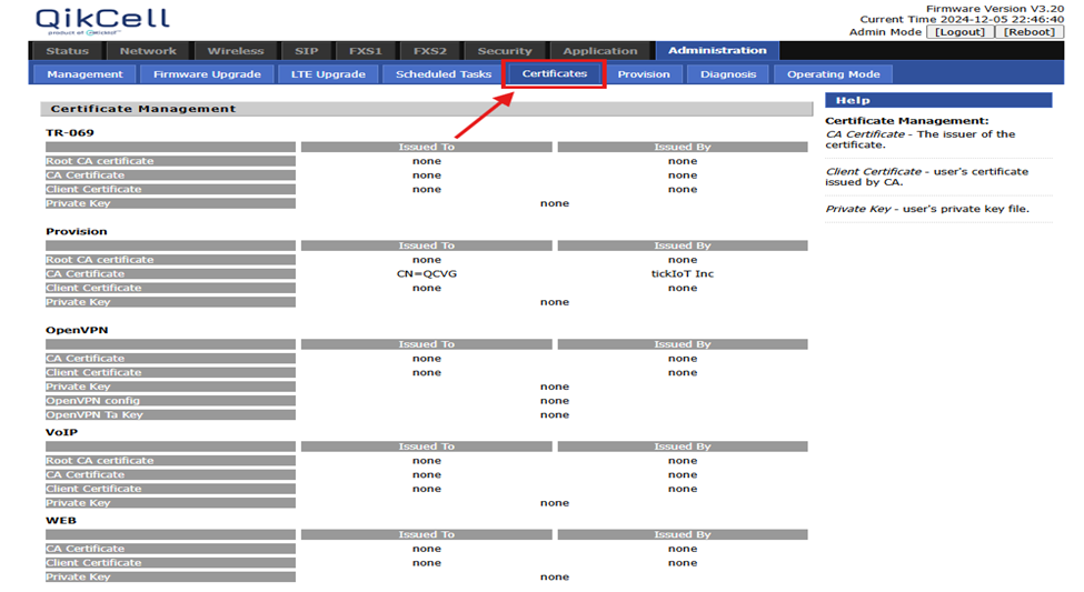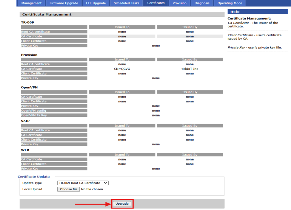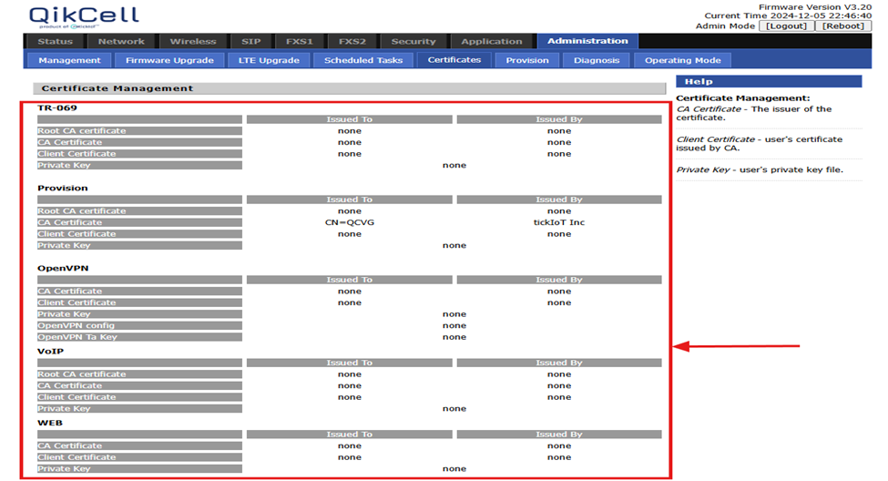 details. The certificates are categorized into five types: TR-069, Provision,