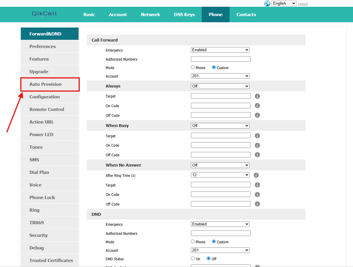 5. Once you have accessed the Phone section, please click on the Auto Provision tab, as shown in the picture below.