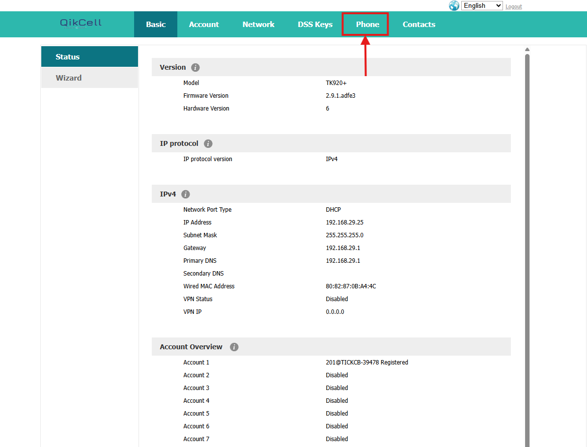 4. Once you click the Sign In button, you will see several sections in the local UI, including Basic, Accounts, Network, DSS Keys, Phone, and Contacts. Please click on the Phone section to access the phone settings, as shown in the picture below.
