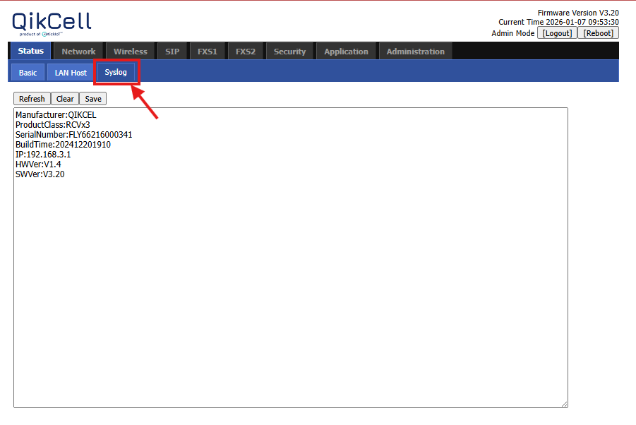 4. From the Status section, select Syslogs to open the RCVx3 Syslogs page. This page displays the device’s system log entries (Syslog), which record key events such as service start/stop activity, network status changes, provisioning actions, and error messages—information that is essential for troubleshooting and support.