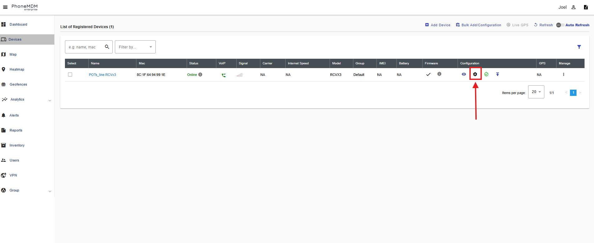 2. Click the below shown Icon to get into the settings of the required device.