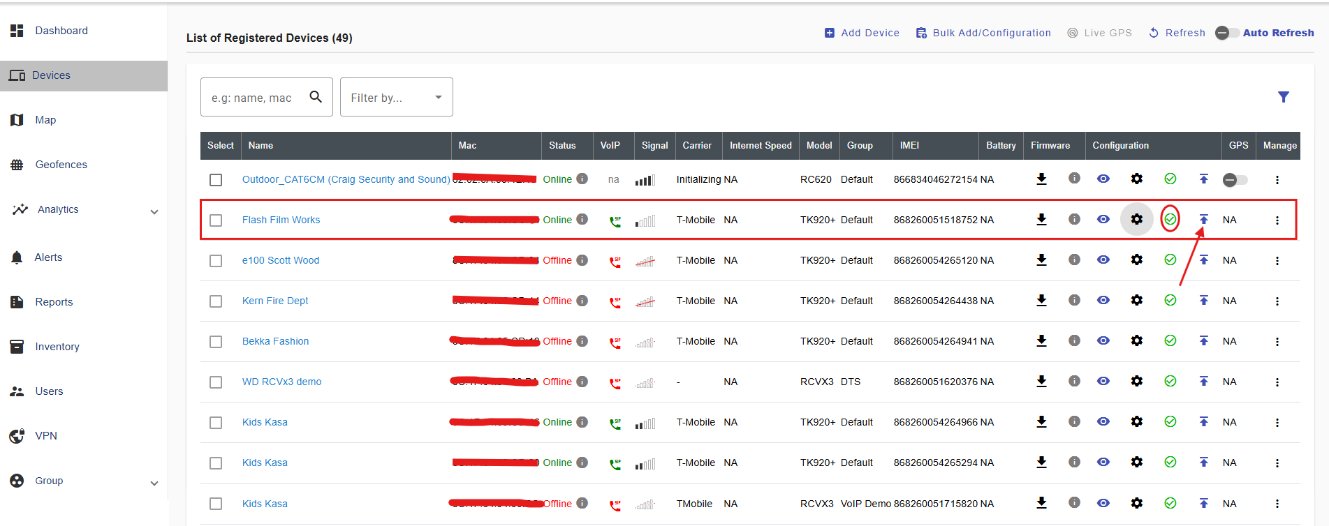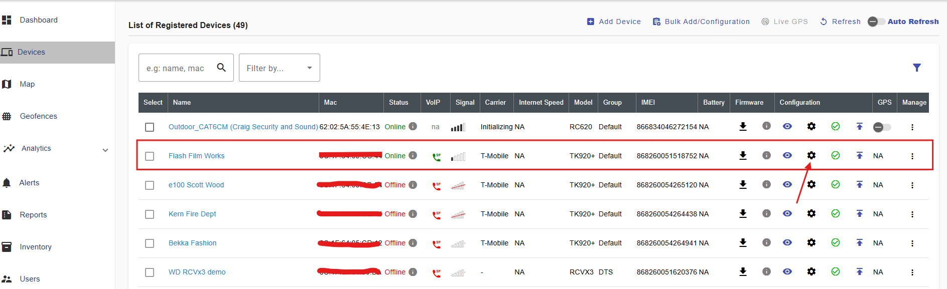 2. Click the below shown Icon to get into the settings of the required device.
