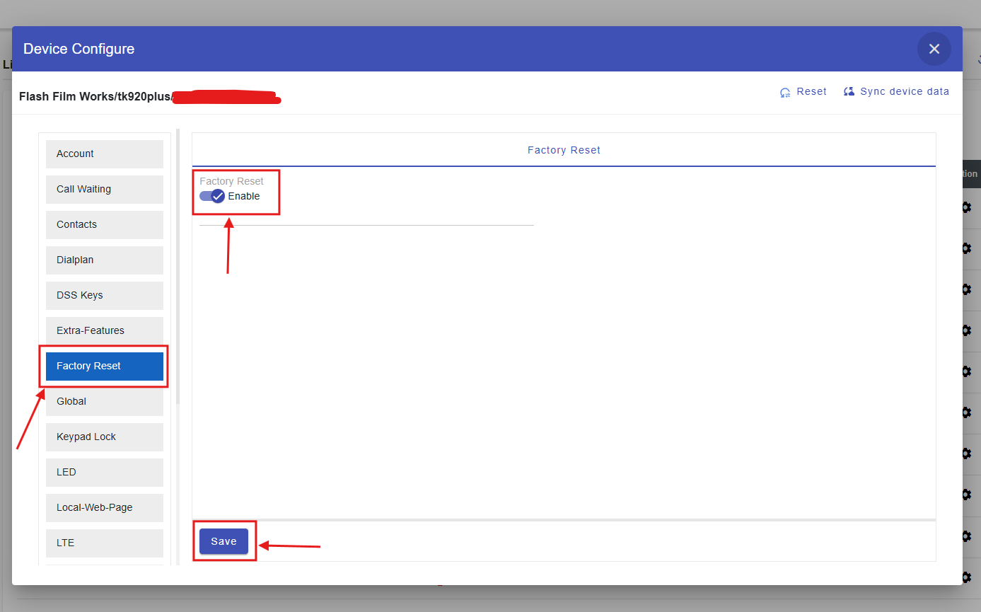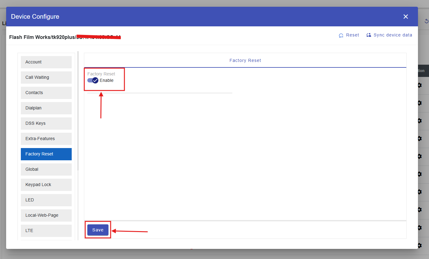 4. After selecting Factory Reset, you will see a Factory Reset Enable/Disable toggle. Please enable this toggle and then click Save, as shown in the image below.